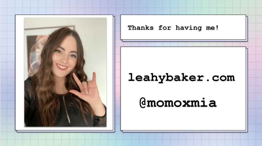 Thanks for having me today and I hope you learned some new things. If you have questions, feel free to drop them in the chat, or you can connect with me on socials @momoxmia or my website leahybaker.com. 😀