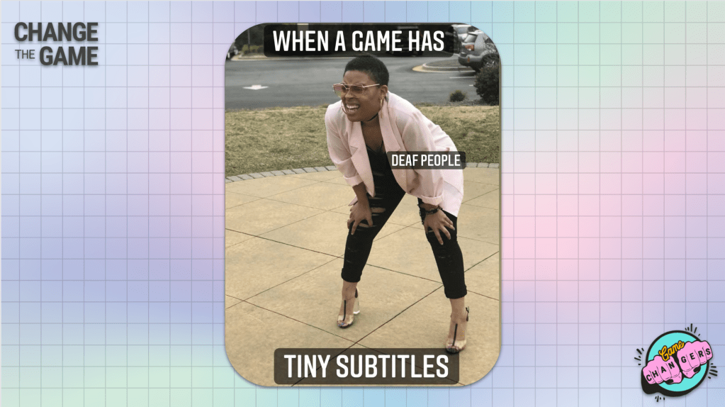 So we’re noticed a lot of different types of accessibility. But we want to make sure that when we are implementing accessibility, we can do more than just the bare minimum. For example, just because a game has subtitles, doesn’t mean it’s 100% accessible to deaf players. Sound cues might not have corresponding visual cues. Or in every deaf gamer’s nightmare, the font might be too small to actually read.