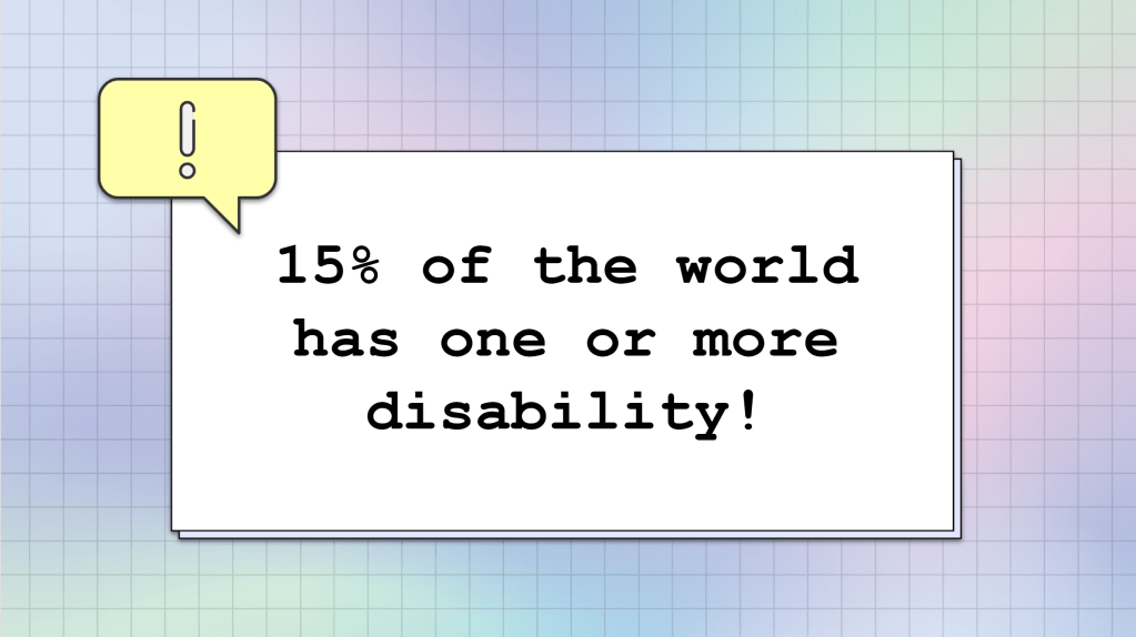 15% of the world has one or more disability. That is roughly 1 in 7 people, and that’s over a billion people on the planet. We learn about common disabilities such as hearing, vision, speech, cognitive, and motor. If you check any dictionary, you’ll find that disability tends to be defined as, “a physical or mental condition that limits a person’s movements, senses, or activities.”