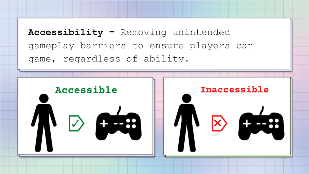 Accessibility is linked to practices of inclusive and universal designs, but it highly focuses on people with disabilities. Meaning, making sure someone who is disabled can, in our case, play our games.